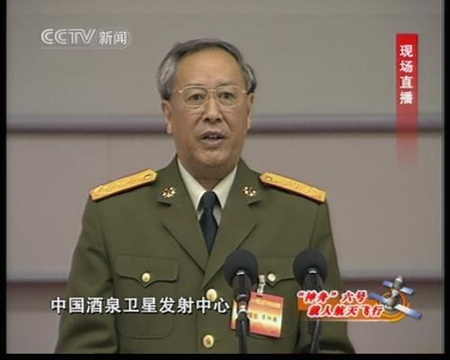 陳炳德:尊敬的胡總書記、溫總理,各位領導、各位來賓,同志們,根據航天城的測量結果,我現在鄭重宣布,神舟六號載人飛船發射取得圓滿成功。